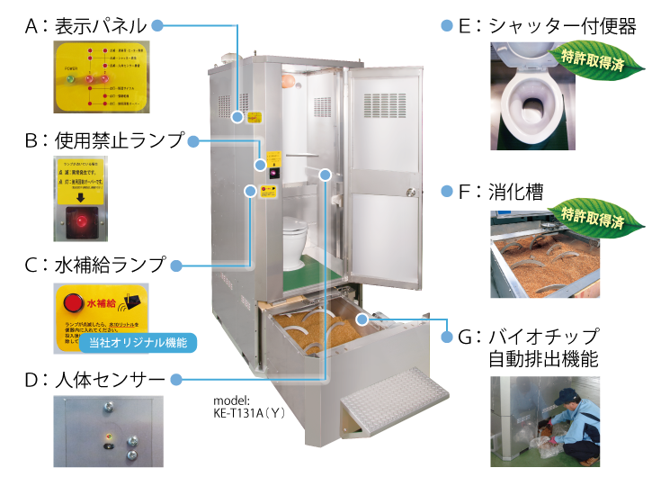 F | 消化槽 | バイオチップが入ってます。槽内環境を微生物の増殖に適した環境にコントロール(水分・温度・酸素量)し、臭気の発生を抑え排泄物を効率よく分解処理します。 |