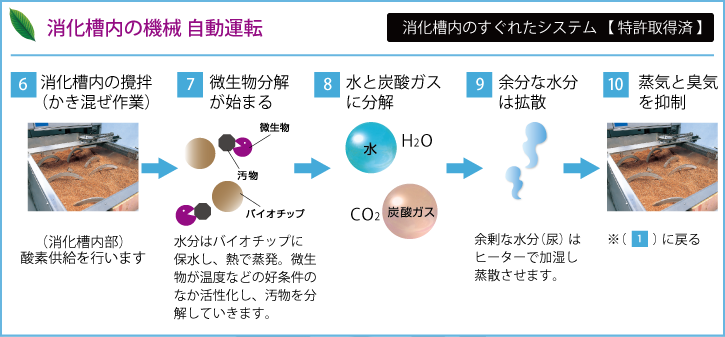 コンピュータで、微生物が生息・増殖する環境(水分・温度・酸素)を自動制御。微生物の活発な活動で臭気の発生を自動制御で抑制し、快適な使用環境を提供します。