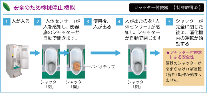 便器底にシャッターが付いており、トイレに入ると「開」、トイレから出ると「閉」。人の出入りに応じてシャッターが自動で開閉します。消化槽の臭気や湿気などが室内に入るのを防ぎます。 |
